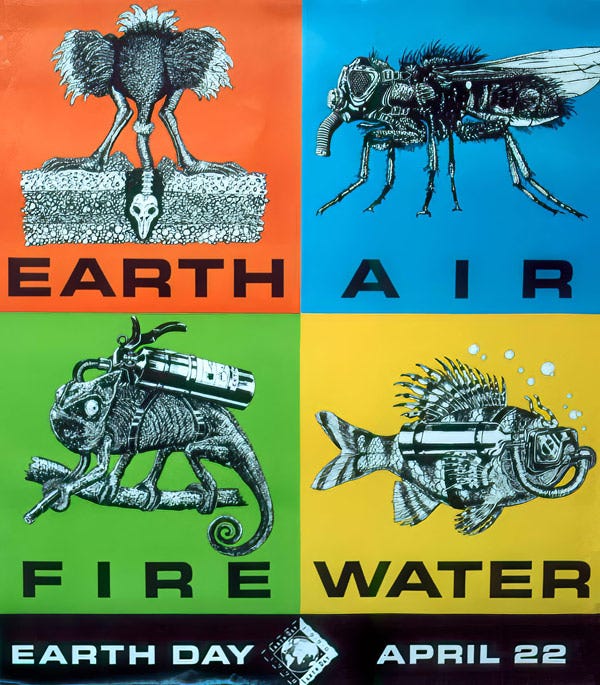 The iconic Earth Day 1990 Earth, Air, Fire, Water poster was produced by Robbie Conal, Debbie Ross, and Yukari Saito, and was printed by Westland Graphics, Burbank, CA.
