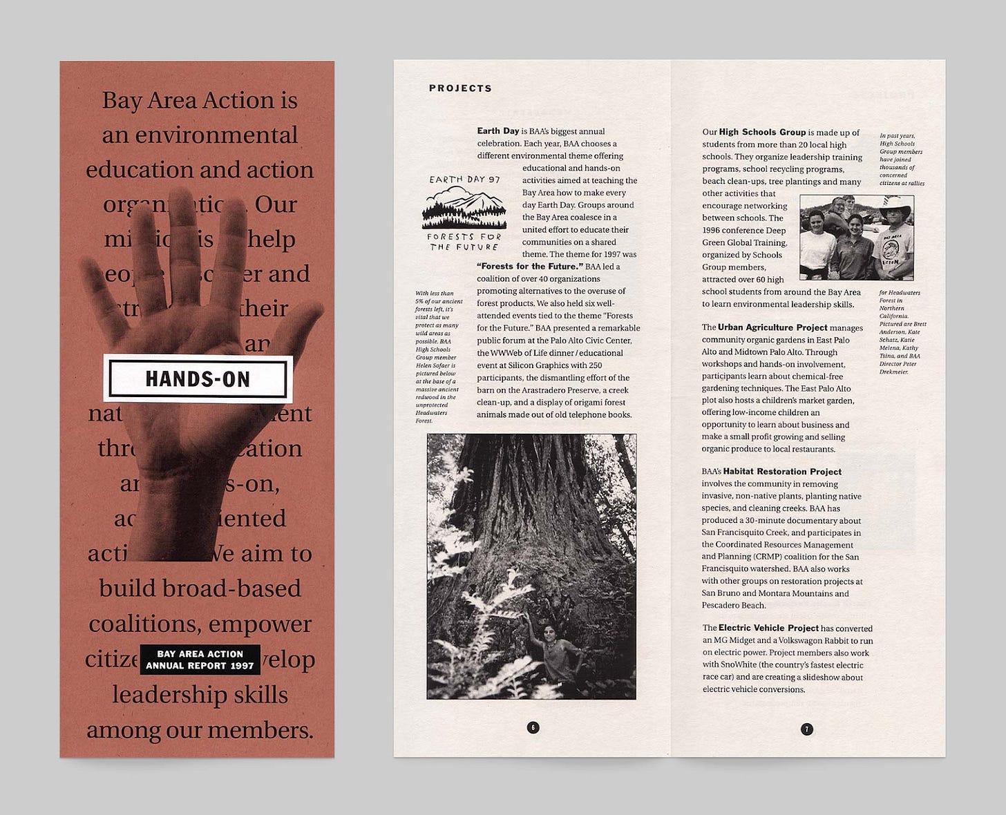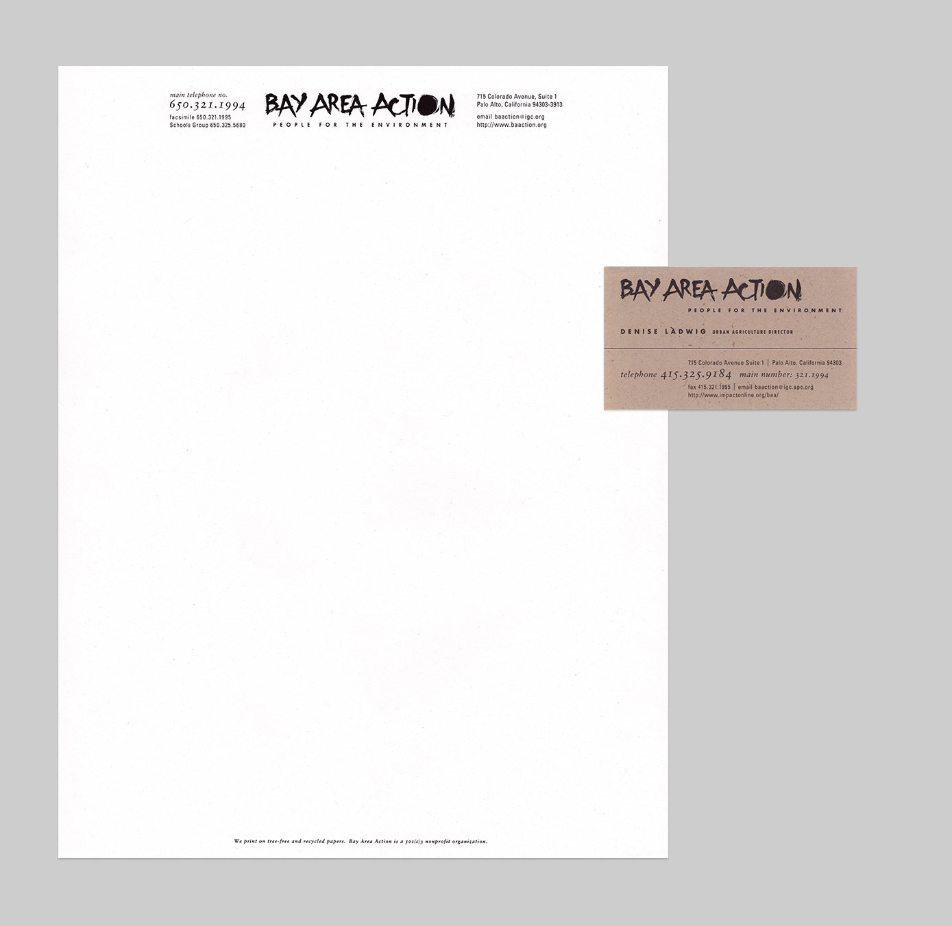 In 1996 I designed a new logo and stationery system (letterhead, business cards, et al) for BAA, using the amazing “ACTION” masthead I’d seen on the cover of a hundred newsletters by then. It was such a powerful, bold wordmark, but it didn’t have the “BAY AREA” to go with it. By 1996, nobody could remember who made the original masthead back in 1990. (Although I can happily report we confirmed in 2025 that it was created by Jing Jing Tsong; see above.)