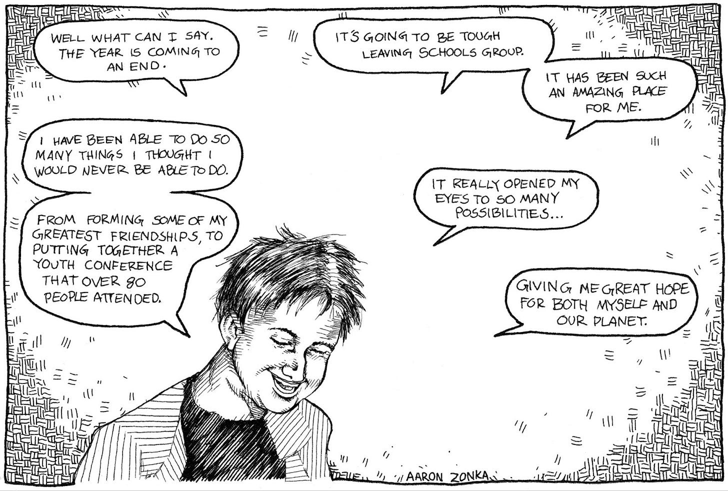 Aaron became one of the Schools Group’s leaders, helping organize the Deep Green Global Training conference. When asked to write a reflection of his time at Acterra upon his graduation in 2004, he instead used his prolific talents to draw his touching goodbye.