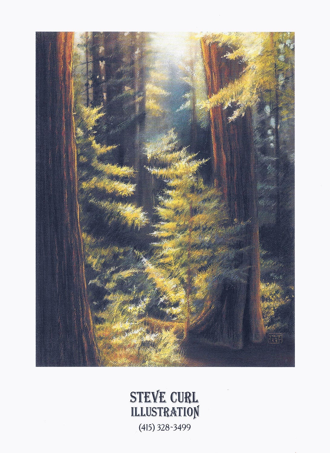 Steve donated a gorgeous color illustration of old-growth redwoods that was awarded in a raffle at the Festival for the Forests in 1991. Beth Delson reported in 2025 that she still has it in her home.