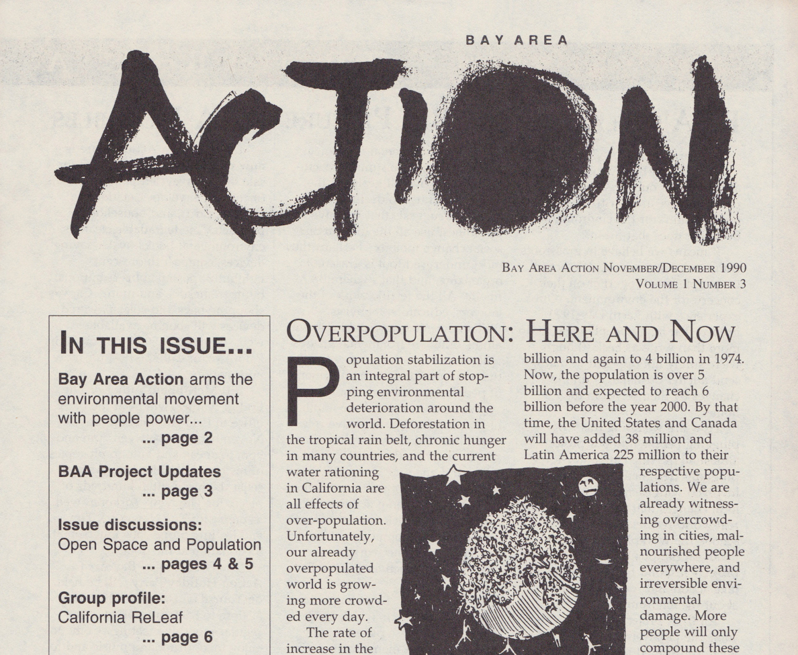 I got out my India ink, brushes, and some rough paper, and went to work trying to emulate the hand-lettered “ACTION” with new letters: B, A, Y, A, R, E, A… Eventually, after everything dried, I scanned them in and manipulated the letters in Photoshop until we had a new, complete logo that finally read: BAY AREA ACTION. It’s been BAA’s official logo ever since.